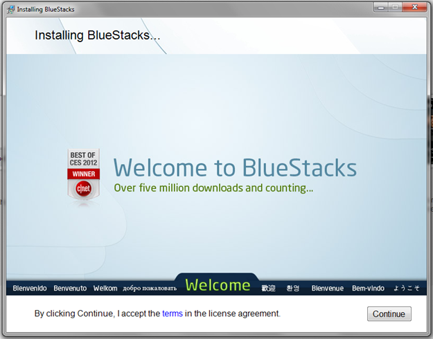 1. Go to Bluestacks.com and download the application for your operating system. Bluestack application is available in Windows and MAC. Once downloaded, open the file and you will see a window below. Click Continue button at the bottom right. Bluestacks installation process will begin. Installation process should take approximately 3 to 5 minutes depending on the speed of your computer